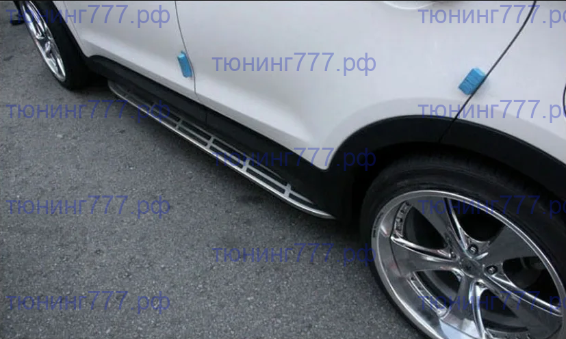 Боковые пороги на Хендай Санта Фе 3 обеспечивают комфорт посадки в автомобиль пассажирам, особенно удобны эти пороги для детей и пожилых людей. Также это защита ваших дверей от повреждения на тесных парковках от ударов дверьми соседних машин. Обращаем внимание что штатные передние брызговики вам придется снять либо доработать для установки с порогами.