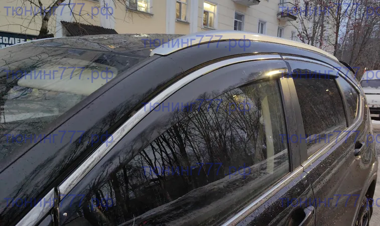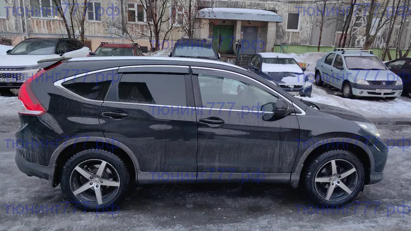 Дефлекторы стекол дверей, накладные 4шт. на скотче + доп. крепеж на скобах, для автомашины HONDA CR-V 4 ( 2012 - 2018 г.в.) имеют нержавеющийа а не пластиковый молдинг по верхнему контуру. Задний дефлектор немного короче самой рамки двери (на 3-4мм). Вес комплекта 1.3кг.