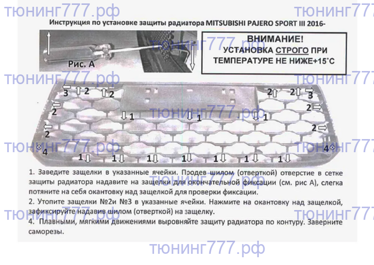 Из всего этого следует, что защита радиатора в виде алюминиевой сетки в передний бампер это опция первостепенной необходимости для Mitsubishi Pajero Sport (2016-2021) дорест. Габариты в штатной карт. упаковке - 113х27х8см. Решётка бампера для авто Митсубиши Педжеро Спорт 3 ( 2016 - 2021 года дорестайлинг в РФ) без штатных датчиков парковки была разработана для тех, кому не безразличен внешний вид автомобиля, а также важна защита радиатора от повреждений камнями, забиванием грязью и насекомыми. Установив решетку бампера Mitsubishi Pajero Sport , вы увеличите срок службы радиатора кондиционера и радиатора охлаждения. ВОЗМОЖЕН ЗАКАЗ ТАКЖЕ И 4-х ВЕРХНИХ ЧАСТЕЙ В РЕШЁТКУ РАДИАТОРА. Сетка выполнена из алюминия окрашенного в черный цвет. Окантовка защиты радиатора сделана из резины черного цвета. Решётка для автомобиля Pajero Sport 3 может быть установлена за 10 минут без участия автосервиса и доп. вложений, снятие бампера не требуется - она просто и надежно защелкивается в штатные места автомобиля Мицубиси Паджеро Спорт 3. Остерегайтесь более дешевых некачественных подделок! Срок поставки к Вам соствит от 3-х раб. дней, после оплаты. - "А какие гарантии, что меня не обманут?" (с) Домен тюнинг777.рф зарегистрирован 11.01.2011 - более 15 лет назад. Мы в сфере тюнинга давно и надолго. Отзывы о нас: Яндекс карты - ссылка ВК группа - ссылка Драйв2 - ссылка Авито - по запросу (ссылка есть, но постоянно меняется у Авито) Сопутствующие товарыОтзывы о Решётка-сетка в бампер алюминиевая черная для Pajero Sport 3Отзывов пока не было. Вы можете оставить его первым