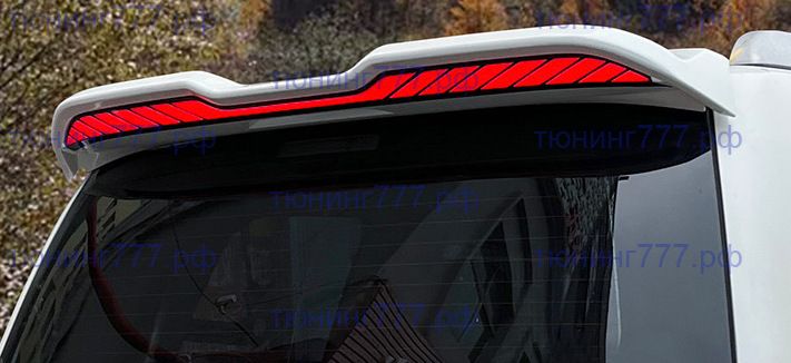 Тюнинг задний спойлер на джип Toyota Land Cruiser Prado 2009 - 2022 года имеет 4 режима работы: режим приветствия (цвета переливаются динамически), красный стоп-сигнал/габариты, и оранжевые поворотники (динамические). Производитель - КНР.